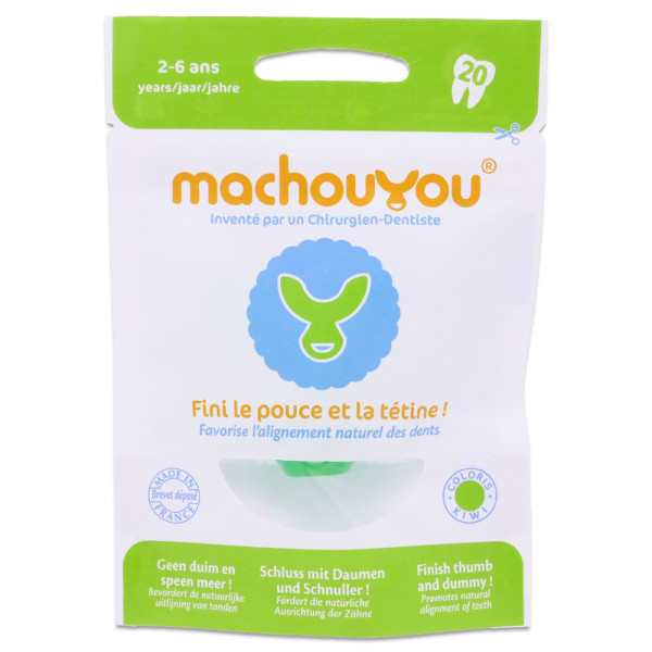 Ce produit, conçu par le laboratoire Machouyou, est spécialement adapté aux enfants âgés de 2 à 6 ans qui ont encore la mauvaise habitude de sucer leur pouce ou leur tétine et pour réaligner leurs dents.
