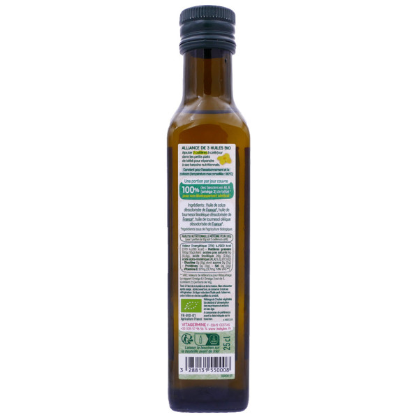 Composée d'huiles végétales françaises, elle est riche en Oméga 3 et 6, essentiels pour le développement normal du cerveau et de la vision. Une seule cuillère par jour couvre 100% des besoins en acide alpha-linolénique (ALA), soutenant ainsi le développement normal du cerveau et des tissus nerveux. La vitamine E, présente en abondance, contribue à la protection des cellules contre le stress oxydatif. Sans additifs ni conservateurs, cette huile garantit une pureté optimale pour les tout-petits.