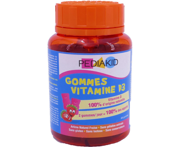 Gommes Vitamine D3 de PEDIAKID à prix pas cher, le complément alimentaire adapté aux enfants et aux pré-adolescents (à partir de 3 ans) dans votre parapharmacie en ligne pas cher, apport de vitamine D3 qui contribue à une croissance et un développement osseux normaux.