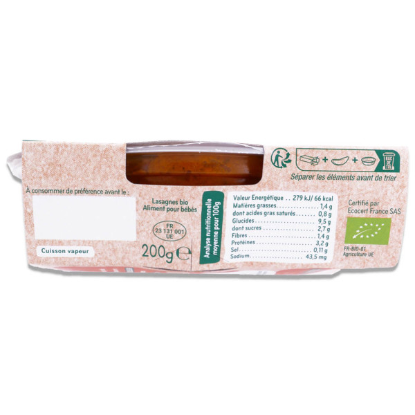 Carottes de France* 28%, eau de cuisson, purée de tomates de Nouvelle-Aquitaine* 15%, pâtes lasagnes cuites* 14% (semoule de blé dur*, eau, farine de riz*, blanc d'œuf*), purée d'oignons de France* 7%, viande bovine fermière de Nouvelle-Aquitaine* 5%, parmesan d'Italie*, crème fraîche de France*, amidon de maïs*, basilic de France*, thym de France*.Contient : gluten, lait, oeuf. Peut contenir des traces de : poisson, fruits à coque, celeri, soja, sesame, mollusques, crustacés, sulfites, moutarde