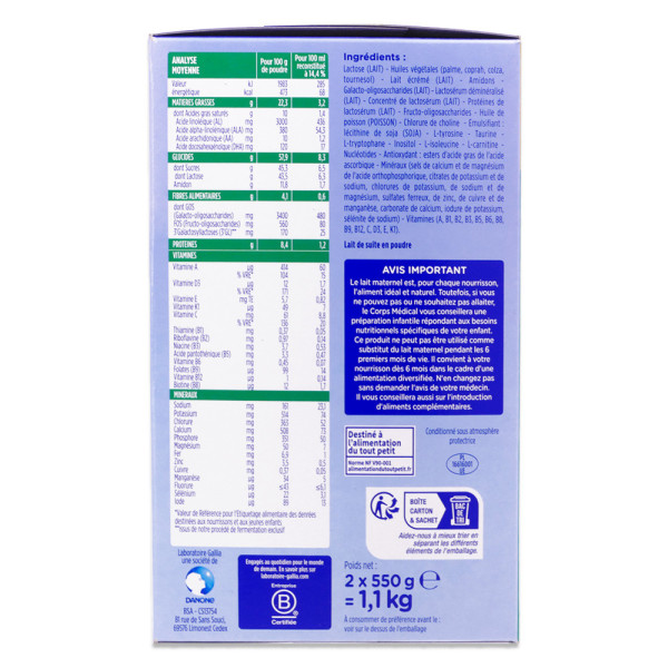 Lactose (LAIT) - Huiles végétales (palme, coprah, colza, tournesol) - Lait écrémé (LAIT) - Amidons - Galacto-oligosaccharides (LAIT) - Lactosérum déminéralisé (LAIT) - Concentré de lactosérum (LAIT) - Protéines de lactosérum (LAIT) - Fructo-oligosaccharides - Huile de poisson (POISSON) - Chlorure de choline - Emulsifiant : lécithine de soja (SOJA) - L-Tyrosine - Taurine - L-Tryptophane - Inositol - L-Isoleucine - L-Carnitine - Nucléotides - Antioxydant : esters d'acide gras de l'acide ascorbique - Minéraux (sels de calcium et de magnésium de l'acide orthophosphorique, citrates de potassium et de sodium, chlorures de potassium, de sodium et de magnésium, sulfates de fer, de zinc, de cuivre et de manganèse, carbonate de calcium, iodure de potassium, sélénite de sodium) - Vitamines (A, B1, B2, B3, B5, B6, B8, B9, B12, C, D3, E, K1).