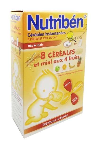 Les céréales instantanées NUTRIBEN au procédé de fabrication sans gluten et sans sucres ajoutés pour une bonne digestion, sont élaborées pour faire découvrir aux bébés des consistances et saveurs différentes lors du passage du biberon à l'assiette. Ces céréales instantanées sont prêtes à l'emploi pour les diluer directement dans le lait du biberon, du bol ou de l'assiette. Les céréales au miel et 4 fruits composées de 8 céréales hautement sélectionnées, et 4 fruits riches en vitamines et minéraux, nécessaires pour la bonne croissance et le bon développement, vont permettre aux touts-petits de goûter à d'autres saveurs avec l'alimentation diversifiée en incorporant dans le lait ces céréales au bon gout fruité, à la texture veloutée qui se digèrent bien et s'homogénéisent bien dans le lait