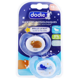 Les sucettes DODIE aux motifs ludiques sont développées par des experts pour répondre de la meilleure façon au besoin naturel de succion de bébé en lui procurant réconfort et bien-être. La forme physiologique (ou biseautée) de la sucette permet une prise en bouche naturelle et garantit le bon positionnement de la sucette en réduisant les risques d’irritation de la peau fragile grâce à sa collerette en tritan confortable et légère avec des trous d’aération. La téterelle très fine et aplatie respecte le développement naturel du palais de bébé. Le bouton phosphorescent pour retrouver facilement la sucette la nuit.