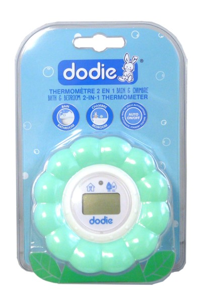 Les accessoires Dodie sont développés par des experts pour répondre de la meilleure façon aux besoins des bébés et faciliter la vie des parents. Le thermomètre 2 en 1, permet grâce à son écran digital pour une vision claire de la température, de mesurer la température de l’eau du bain et de l’air ambiant de sa chambre pour une toilette et un sommeil agréable et sans risque. Le thermomètre signale par un voyant de sécurité lorsque la température de l’eau ou de la chambre dépasse 38°C. Pour préserver la durée de vie des piles, le thermomètre se met en veille automatiquement lorsque il n’est pas utilisé un certain temps.