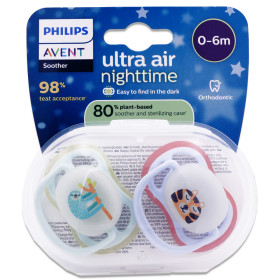 PHILIPS AVENT ULTRA AIR NUIT 0-6M 2 SUCETTES Lion/Paresseux est en vente en ligne sur le site de votre parapharmacie à prix pas cher, une sucette conçue pour le confort des bébés de 0 à 6 mois, idéale pour un usage nocturne. Coloris et motifs selon disponibilités