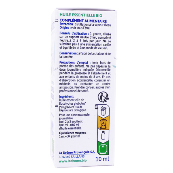 Complément alimentaire à base d'huile essentielle d'eucalyptus globuleux, Huile essentielle d’Eucalyptus globulus issu de l’Agriculture Biologique.