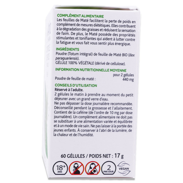 Ingrédients : Poudre (totum intégral) de feuille de maté bio (Ilex paraguariensis) Gélule 100 % végétale (dérivé de cellulose)
