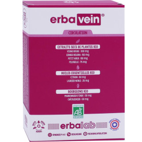 ERBALAB est un laboratoire français spécialisé dans la conception de compléments alimentaire de phytothérapie et micronutrition. Conditionné en flacon airless, ces compléments alimentaires permettent d’être administré par voie sublinguale pour des effets rapide sur les besoins recherchés (tonus, système immunitaire, infections urinaires,…), et également de préserver les extraits de plantes de la lumière et l’introduction de l’air pouvant être à l’origine de la dégradation des actifs. ERBAVEIN du laboratoire ERBALAB à base d'extraits secs de plantes bio (vigne rouge, ginkgo biloba, petit houx et piloselle), d’huiles essentielles bio (citron, laurier noble) et de macérats-mères de bourgons bio (maronnier d’Inde, châtaignier) nterviennent de façon bénéfique sur la circulation sanguine et la lourdeur des jambes. Les extraits secs de plantes bio et macérats-mères de bourgions bio contribuent à favoriser la circulation sanguine normale dans les jambes en renforçant la paroi des vaisseaux sanguins, et à drainer pour retrouver des jambes légères. Les huiles essentielles bio de citron et laurier noble complètent la formule. Pour éviter le passage des actifs dans la muqueuse intestinale et digestive, les gélules sont fabriquées par micro-encapsulation, afin d’être absorbé dans le système sanguin. Rapidement les jambes retrouvent de la légèreté.