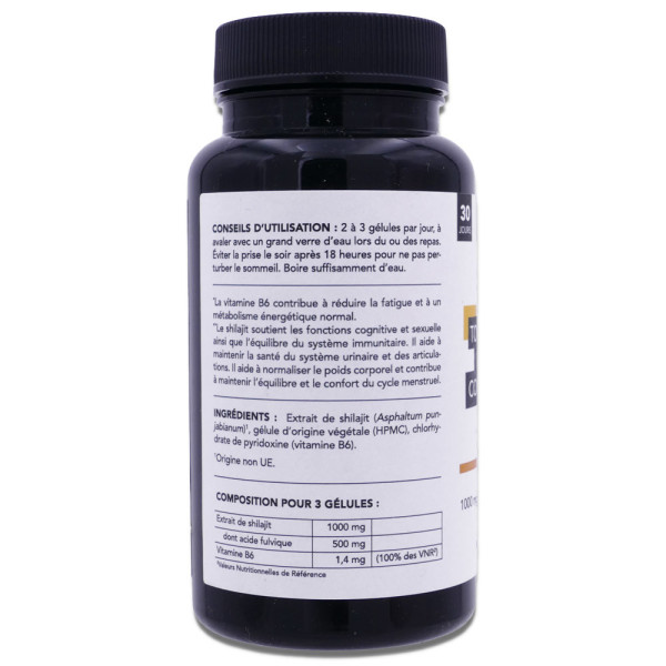 Composition pour 3 gélules : Extrait de shilajit : 1000 mg dont acide fulvique : 500 mg Vitamine B6 : 1,4 mg (100% VNR*). *Valeurs Nutritionnelles de Référence.