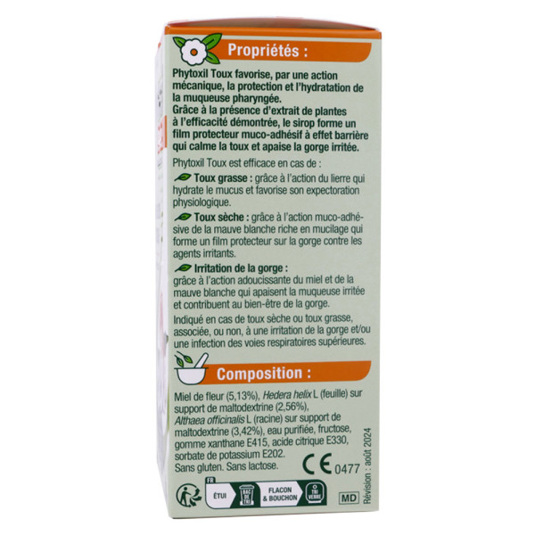 Le laboratoire Sanofi propose ce dispositif médical à base de plantes et de miel, conçu pour soutenir le confort respiratoire. Le lierre est reconnu pour participer au fonctionnement normal du système respiratoire. La mauve blanche participe au confort de la gorge grâce à ses propriétés apaisantes. Le miel et la mauve blanche, connus pour leurs qualités adoucissantes, soutiennent la fonction des voies respiratoires, offrant un soulagement naturel. Ce sirop est une solution idéale pour ceux qui cherchent à maintenir le confort de leur gorge et de leurs voies respiratoires de manière naturelle. Découvrez le pouvoir des plantes et du miel pour un confort respiratoire optimal. Essayez PHYTOXIL TOUX et ressentez la différence dans votre quotidien.