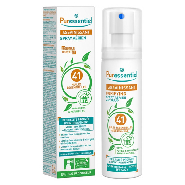 Spray aérien aux 41 huiles essentielles à prix discount de PURESSENTIEL, le produit assainissant pour traiter l’air intérieur, limiter les sources d'épidémies, chasser les polluants et les odeurs désagréables dans votre parapharmacie en ligne.