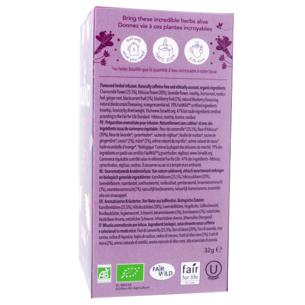 fleur de camomille* (25,5%), fleur d'hibiscus* (20%), fleur de lavande*, cynorrhodon*, racine de réglisse*, feuille de rooibos*, racine de gingembre*, cassis* (3%), mûre* (2%), arôme naturel de myrtille*, arôme naturel de cassis*, huile essentielle d'orange*.*biologique.