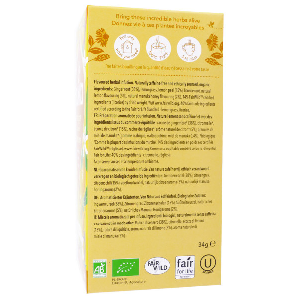 Infusion en sachets individuels à base de plantes bioRacine de gingembre (38 %), citronnelle*, écorce de citron* (15%), racine de réglisse*, arôme naturel de citron* (5%), granules de miel de manuka* (gomme arabique, maltodextrine, miel de manuka 0,4%).* Biologique.