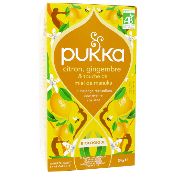 PUKKA INFUSION CITRON GINGEMBRE ET MIEL DE MANUKA 20 SACHETS est en vente en ligne sur le site de votre parapharmacie à prix pas cher, une infusion bio à savourer au quotidien, idéale pour les amateurs de boissons chaudes sans caféine.