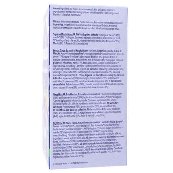 Soirée Étoilée. Naturellement sans caféine¹ : sommités fleuries d'avoine* fleur de camomille* (18,1%), racine de réglisse*, fleur de lavande* (14%), fleur de tilleul*, feuille de tulsi*, racine de valériane* (4,9%).*biologique. ¹Comme la plupart des infusions du marché. 28% des ingrédients en poids sec certifiés FairWild™ (réglisse, tilleul). Commerce équitable contrôlé selon le référentiel Fair for Life : 63% des ingrédients- avoine, réglisse, tilleul, tulsi.