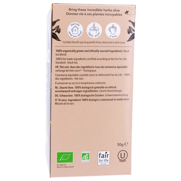 Pukka propose ici une préparation simple, avec une infusion au profil corsé et aromatique. Ce mélange de thés noirs issus de l’agriculture biologique apportent une saveur intense, une couleur soutenue à l’infusion et une composition adaptée à une consommation quotidienne dans le cadre d’une routine bien-être.