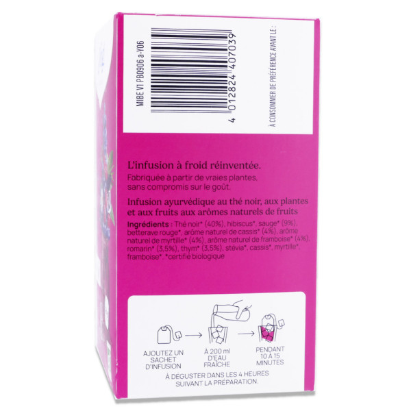 Thé noir*, hibiscus*, sauge*, betterave rouge*, arôme naturel de cassis*, arôme naturel de myrtille*, arôme naturel de framboise*, romarin*, thym*, stévia*, cassis*, myrtille*, framboise*. *certifié biologique