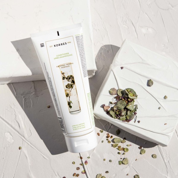 L'après-shampoing Aloes & Dictame de KORRES, le soin hydratant et démêlant destiné aux cheveux normaux.