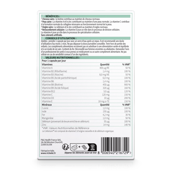 Cheveux Peau Ongles est un complément alimentaire à base de 6 minéraux essentiels, de CELLENIUM d’origine naturelle et de biotine pour révéler toute la beauté des cheveux, de la peau et des ongles. Les vitamines vont : jouer un rôle dans le processus de division cellulaire (vitamine D et A) ; et contribuer à la formation normale du collagène qui est importante pour le fonctionnement normal de la peau (vitamine C). Le zinc et la vitamine A vont participer au maintien d’une peau normale. Cheveux Peau Ongles de RICHELET contient également de la biotine pour contribuer au maintien de cheveux normaux.