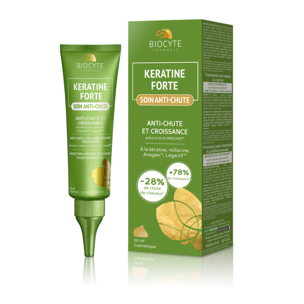 La gamme Kératine des laboratoires BIOCYTE est composée de compléments alimentaires et produits cosmétiques à base de kératine pour agir sur la chevelure et les ongles fragilisés et abîmés afin de redonner toute leur beauté. Le Soin Anti-chute KERATINE FORTE est un traitement anti-chute qui redonne aux cheveux de la force, du volume et de la brillance. Composé de de Legactif, le soin va renforcer le cheveu et favoriser la bonne circulation sanguine du cuir chevelu pour revitaliser. Il apporte de la kératine (déjà présente dans les cheveux), pour lutter contre la chute des cheveux, en les nourrissant, leur redonnant toute leur force et leur structure. L'Anagain freinera la chute des cheveux et favorisera leur croissance pour une chevelure plus dense. Le Soin Anti-chute apporte de la Miliacine (100% végétal) riche en lipides pour rendre de la brillance à vos cheveux et stimuler leur croissance. Les cheveux sont brillants et ont plus de volume, la chute est ralentie.