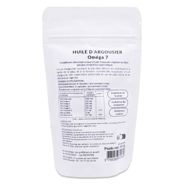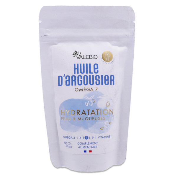 Le laboratoire Valebio propose une formule unique à base d'huile d'argousier bio, originaire du Tibet. Cette huile précieuse est extraite des baies, pépins et noyaux de l’Hippophae rhamnoides par première pression à froid, garantissant une qualité optimale. Naturellement riche en oméga-7, notamment en acide palmitoléique, elle contribue au maintien des muqueuses normales et participe à l'hydratation de la peau. Les oméga-7 soutiennent également le confort oculaire en cas de sécheresse. Intégrer ces capsules dans votre routine quotidienne participe au bon fonctionnement des systèmes corporels grâce aux propriétés naturelles de l'argousier.