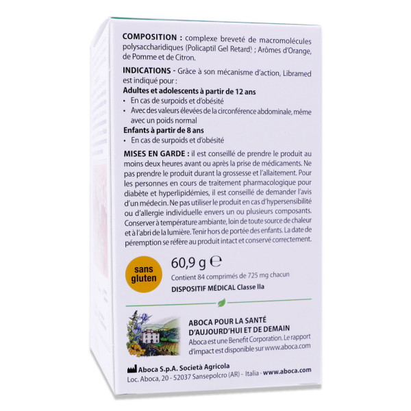 Le laboratoire ABOCA est reconnu pour son engagement envers des produits naturels de haute qualité. LIBRAMED est un dispositif médical innovant qui participe au contrôle du poids chez les adultes et les enfants à partir de 8 ans. Libramed utilise Policaptil Gel Retard® pour créer un gel dense dans l'intestin, ce qui contribue à contrôler le pic de glycémie postprandial en réduisant la quantité et la vitesse d'absorption des glucides. Ce gel restreint aussi l'absorption des lipides, favorise le transit intestinal et stabilise la consistance des selles. Ce produit est conçu pour s'intégrer facilement dans un mode de vie sain et actif. Faites confiance à LIBRAMED pour vous accompagner dans votre démarche de gestion du poids. Découvrez dès maintenant ses résultats et prenez soin de votre silhouette en toute sérénité.