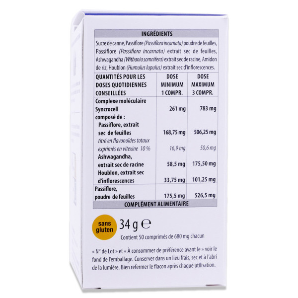 Sucre de canne, Passiflore (Passiflora incarnata) poudre de feuilles, Passiflore (Passiflora incarnata) extrait sec de feuilles, Ashwagandha (Withania somnifera) extrait sec de racine, Amidon de riz, Houblon (Humulus lupulus) extrait sec d'inflorescences