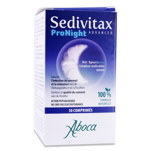 ABOCA SEDIVITAX PRONIGHT 50 COMPRIMES est un complément alimentaire conditionné en comprimés à la formule 100 % naturelle. Sa formule contient des extraits de passiflore et d’Ashwagandha qui favorisent l’endormissement et la relaxation, complétée par de l’extrait de houblon qui participe à un sommeil réparateur. De plus, ce complément alimentaire grâce au complexe moléculaire Synchrocell, bénéficie d’un mécanisme d’action unique qui permet de prédisposer l’organisme à un état métabolique nocturne.