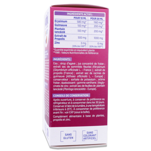 Eau ; sirop d’agave ; jus concentré de fraise ; extrait sec de sommités fleuries d’érysimum (Sisymbrium officinale L. – France) ; extrait de propolis (France) ; extrait sec de racines de guimauve (Althaea officinalis L. – Europe) ; conservateur : sorbate de potassium ; arôme fraise ; épaississant : gomme xanthane ; bisglycinate de zinc ; extrait sec de feuilles de plantain lancéolé (Plantago lanceolata - Europe).