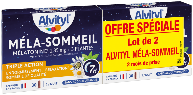 MELA-SOMMEIL GO VITAL Double Action ALVITYL du laboratoire URGO , en vente dans votre parapharmacie en ligne, est un complément alimentaire pas cher conditionné sous forme de gélules, complexe unique de 3 plantes et de mélatonine qui réduit le temps d'endormissement.