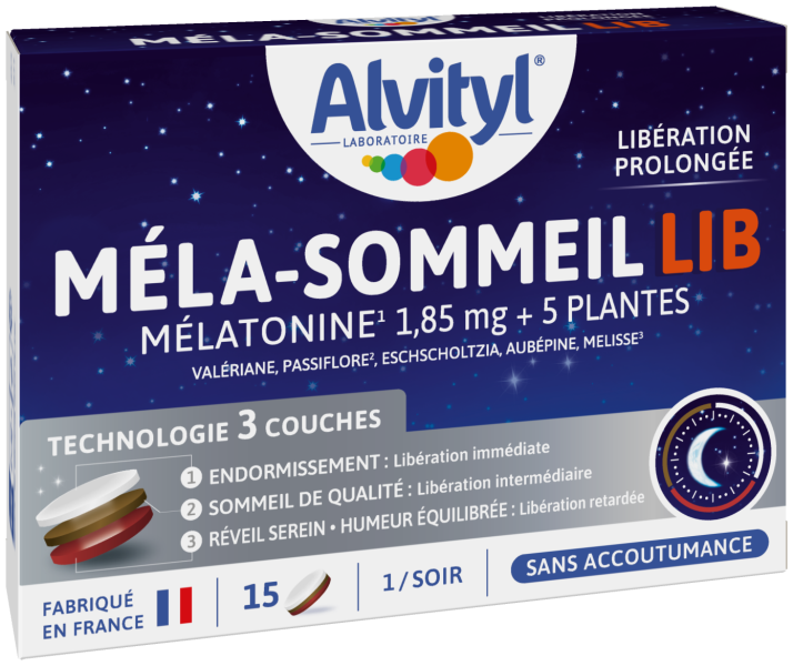 Composition Pour 1 comprimé :COUCHE 1 : 1ère libération : Mélatonine 1 mg ; Valériane 600 mg* ; Vitamine B6 1,4 mg (100% des VNR***)COUCHE 2 : 2ème libération : Mélatonine 0,85 mg ; Passiflore 800 mg* ; Eschscholtzia 30 mg*COUCHE 3 : 3ème libération : Aubépine 210 mg* ; Mélisse 600 mg*Comprimé sans colorant artificiel, sans conservateur** ni édulcorant*Équivalent plante. **Conformément à la réglementation en vigueur. ***Valeurs Nutritionnelles de RéférenceAlvityl® Méla-Sommeil LIB est complément alimentaire sans accoutumance, sans gluten, sans lactose et convient à une alimentation végan.