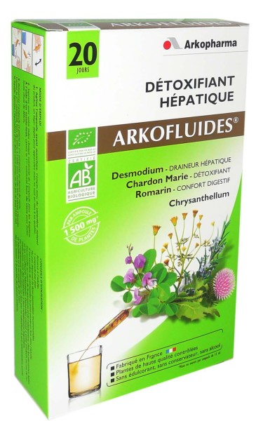 DETOXIFIANT HEPATIQUE Arkofluide d’ARKOPHARMA est un complément alimentaire conditionné sous forme d’ampoules à dluer, à base d’extrait de chardon marie, romarin et desmodium traditionnellement utilisés comme draineur hépatique pour éliminer les toxines, et protecteur du foie afin d’assurer le bon fonctionnement biliaire et hépatique. Le chrysanthellum complète la formule. Sa consommation améliore considérablement le fonctionnement hépatique. Sans alcoo, sans conservateur, sans édulcorant