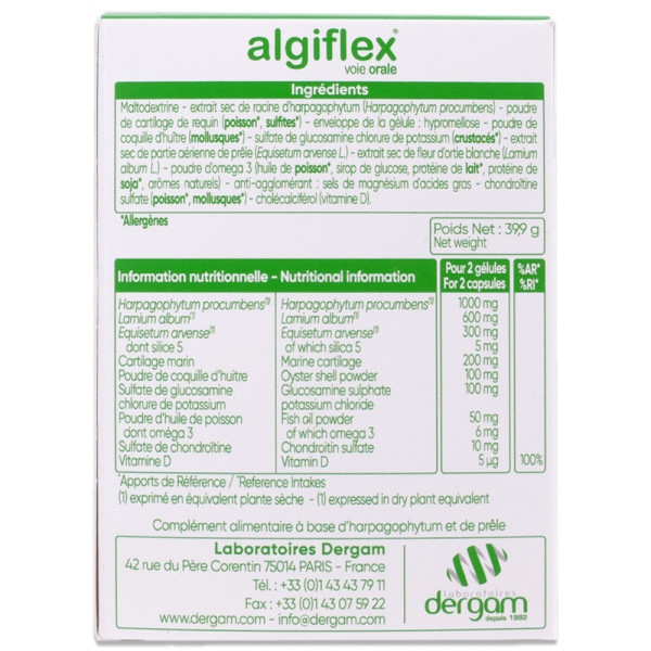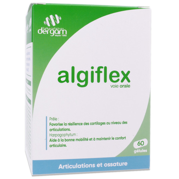 Les laboratoires DERGAM sont experts des compléments alimentaires en gynécologie, ophtalmologie et physiologie générale depuis 1982. Les compléments alimentaires des Laboratoires DERGAM sont sans colorant artificiel et apporte une réponse naturelle dans la vie au quotidien. ALGIFLEX est un complément alimentaire à base d’ Harpagophytum qui aide à maintenir une bonne mobilité et favorise le maintien de la santé des articulations, de chondroïtine, de prêle qui participe à réduire l'inflammation des articulations et à favoriser leur résilience ainsi qu'à conserver celles-ci souples, et de vitamine D qui permet le maintien d'os normaux. La formule d'ALGIFLEX contient également des omégas 3 et du calcium marin.