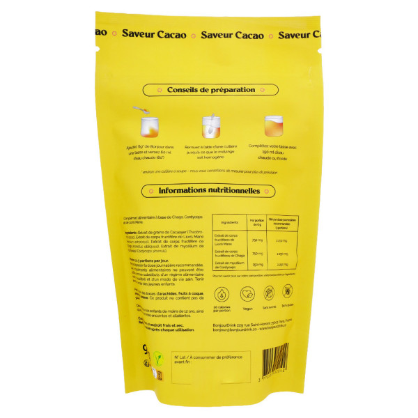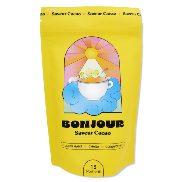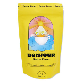 Ce complément alimentaire en sachets de la marque BONJOUR se distingue par ses ingrédients de qualité supérieure. Il contient 2250 mg d’extraits concentrés de champignons biologiques Lion’s Mane, Chaga et Cordyceps par tasse. Ces champignons sont réputés pour leurs propriétés sur l'organisme. Sans caféine, il offre une alternative douce et agréable. Ce produit est vegan, sans lactose, sans sucres ajoutés, sans additifs ni conservateurs, respectant ainsi les besoins des consommateurs soucieux de leur bien-être.