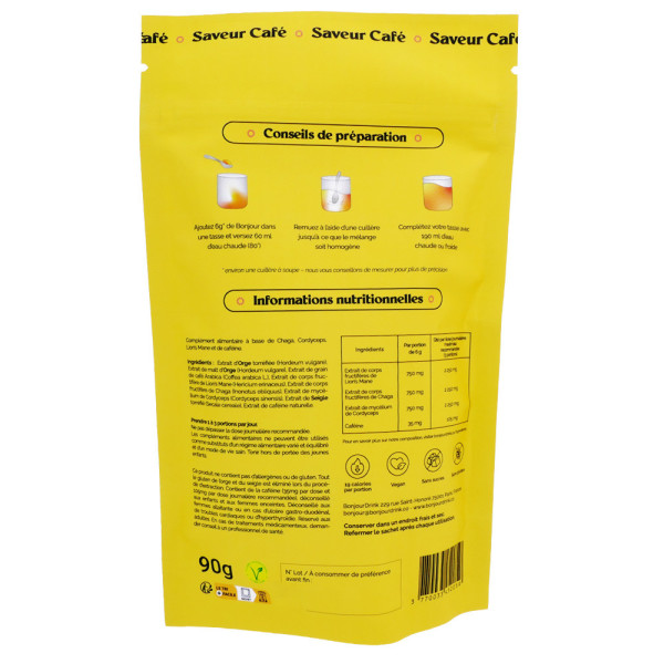 Ce complément alimentaire en sachets de la marque BONJOUR se distingue par ses ingrédients de qualité supérieure. Il contient 2250 mg d’extraits concentrés de champignons biologiques Lion’s Mane, Chaga et Cordyceps par tasse. Ces champignons sont réputés pour leurs propriétés sur l'organisme. Avec seulement 35 mg de caféine par portion, soit cinq fois moins qu'un café traditionnel, il offre une alternative douce et agréable. Ce produit est vegan, sans lactose, sans sucres ajoutés, sans additifs ni conservateurs, respectant ainsi les besoins des consommateurs soucieux de leur bien-être.
