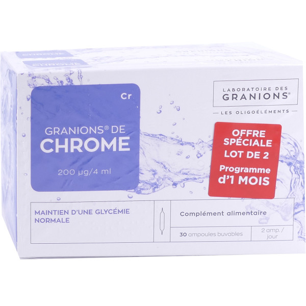 Les Granions de Chrome 200µg/Jour des laboratoires Ea-Pharma constituent un complément alimentaire à base de chrome. La nouvelle formule de Granions De Chrome 200µg/Jour Ea-Pharma est 4 fois plus dosée en chrome : 100µg de chrome par ampoule au lieu de 25µg dans la formule précédente. Spécialiste des oligo-éléments, le Laboratoire Ea-Pharma a mis au point Granions De Chrome 200µg/Jour (2 ampoules de 100 µg par jour) pour répondre aux nouvelles avancées scientifiques.Le chrome est oligoélément essentiel pour le métabolisme des macro-nutriments (glucides et lipides), il contribue au maintien d’une glycémie normale.