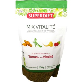 MIX VITALITE Bio Poudre de SUPERDIET, est un complément alimentaire en poudre, à base de 4 extraits de plantes biologique Il contient de la spiruline (algue microscopique riche en protéine et en nutriments dont le fer et les vitamines B), du curcuma (riche en curcumine) de la racine de maca (racine énergisante des Andes) et de l'acérola ,petite cerise riche en vitamine C. Ainsi la vitamine C participe à aider à réduire les états de fatigue et contribuer au fonctionnement normal du système immunitaire.