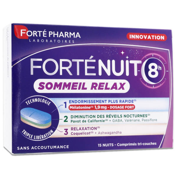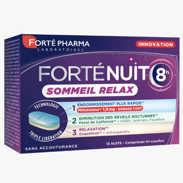 Le laboratoire Forte Pharma propose un complément alimentaire innovant avec une triple action pour le sommeil et la relaxation. La formule contient 1,9 mg de mélatonine* qui contribue à réduire le temps d'endormissement. La mélatonine est libérée immédiatement pour une action rapide. Le GABA, associé à la valériane, la passiflore et le pavot de Californie, est libéré progressivement pour aider au maintien d'un sommeil de qualité en réduisant les réveils nocturnes : le pavot de Californie améliore la qualité du sommeil naturel, Enfin, la dernière phase, avec le coquelicot qui favorise un sommeil réparateur et une relaxation optimale. continue jusqu'à 8 heures. Ce produit ne crée pas d'accoutumance et s'intègre parfaitement dans une routine bien-être. Offrez-vous des nuits paisibles et un sommeil réparateur avec FORTENUIT 8H SOMMEIL RELAX.