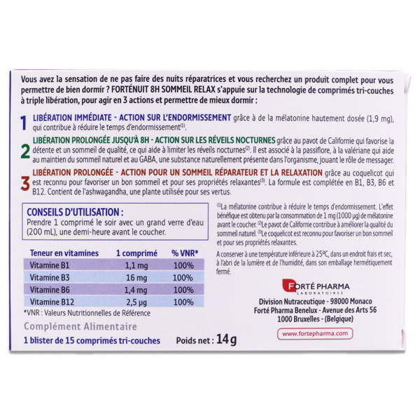 FORTENUIT 8H SOMMEIL RELAX 8H 15 COMPRIMES TRI-COUCHES est disponible en vente en ligne à prix pas cher sur Beautyshop.