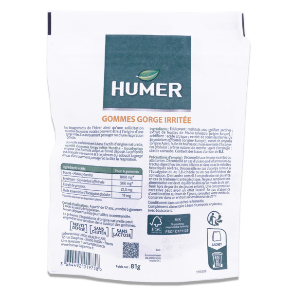 Humer, spécialiste des solutions naturelles, propose ces gommes à sucer au goût menthe eucalyptus, enrichies en actifs d'origine naturelle comme la propolis, la mauve et l'erysimum. Le brevet déposé garantit une formulation unique. L'erysimum, reconnu pour ses propriétés apaisantes, contribue à adoucir la gorge et à soutenir le confort respiratoire. Ces gommes sont idéales pour ceux qui cherchent une solution douce et naturelle pour le confort de leur gorge. Profitez dès maintenant de cette formule innovante pour un apaisement immédiat et efficace.