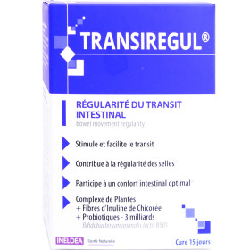 TRANSIREGUL pas cher des laboratoires INELDEA, le complément alimentaire sous forme de gélules végétales à base d’un complexe de plantes associé à des fibres d’inuline de chicorée et des ferments lactiques, dans votre parapharmacie en ligne à prix pas cher.