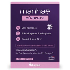 La gamme MANHAÉ développée par le laboratoire VITAVEA a été spécialement conçue pour les femmes pour les accompagner au quotidien à toutes les étapes de la vie. MANHAE MENOPAUSE est un complément alimentaire en capsules sans source d'hormones. Sa formule est composée d’Endophospholipides® composé d'acides gras polyinsaturés à longues chaînes (EPA et DHA), d’oméga 3 de fer de vitamine B9, de vitamine E, de Zinc et d’huile de bourrache. Le Zinc contribue au maintien de cheveux et d'ongles normaux mais également au maintien d'une peau normale, associé à la vitamine E ils participent à la protections des cellules contre le stress oxydatif. Enfin le fer qui aide à réduire la fatigue complète la formule.