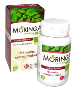 Le complément alimentaire Moringa Oleifera Mémoire Concentration BIO du laboratoire NATURAL NUTRITION, est composé de Moringa Oleifera, un arbre tropical, dont les feuilles sont riches en protéines, et de Ginkgo Biloba, qui participe au maintien d'une bonne fonction cognitive et participe à améliorer la mémoire et la concentration.