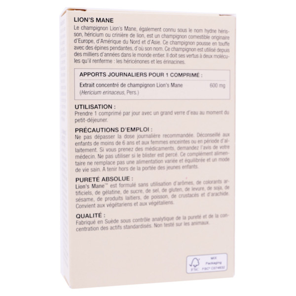 Complément alimentaire à base de champignon. Apports journaliers pour 1 comprimé : extrait concentré de champignon Lion’s Mane (Héricium erinaceus, Pers.) 600mg.