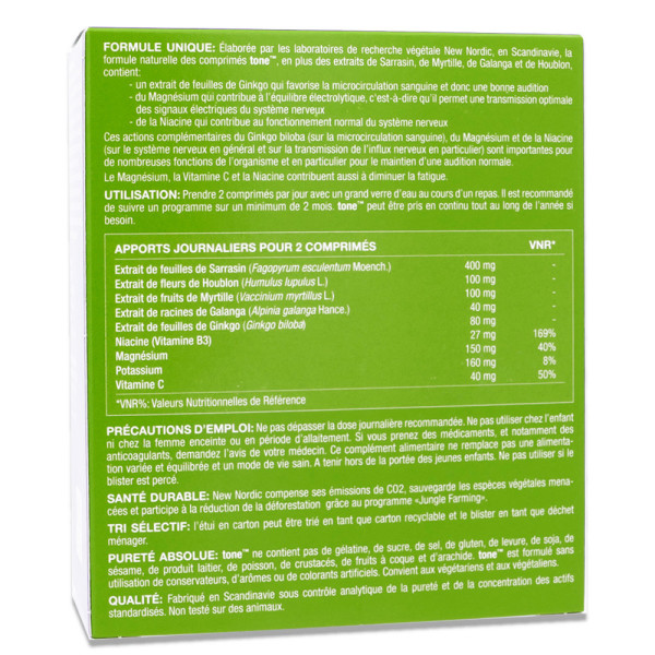Mode d'emploi : Prendre 2 comprimés par jour avec un verre d'eau, de préférence au cours d'un repas. Il est recommandé de suivre un programme sur un minimum de 2 mois. Tone Audition peut être pris en continu tout au long de l'année si besoin.