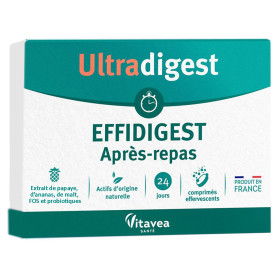 Effidigest, qui propose des solutions naturelles pour améliorer le confort digestif. Les comprimés Effidigest contiennent une combinaison d'ingrédients actifs soigneusement sélectionnés pour leurs propriétés bénéfiques sur la digestion. Ce complément alimentaire contient du malt, de la papaye et de l'ananas, tous dotés d'une activité enzymatique. De plus, il renferme également des ferments lactiques présents naturellement dans notre tube digestif. Les fructo-oligosaccharides, qui sont des substances que la flore intestinale digère, sont ajoutés à la formule pour la compléter. Grâce à sa formule unique, ce complément alimentaire contribue à réduire les sensations de lourdeur et d'inconfort après les repas. Les comprimés Effidigest sont faciles à prendre et conviennent à tous les types de personnes. Ce produit peut vous aider à retrouver un confort digestif optimal. N'hésitez plus et optez pour VITAVEA ULTRAGIGEST EFFIDIGEST APRES REPAS 24 COMPRIMES.