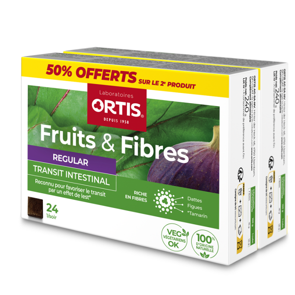 FRUITS & FIBRES Regular Transit Intestinal d’ORTIS pas cher, les cubes riches en fibres alimentaires dans votre parapharmacie en ligne à prix pas cher, avec de la rhubarbe, des figues, tamarin et des dattes. Promo Pack 2 X 24 Cubes.