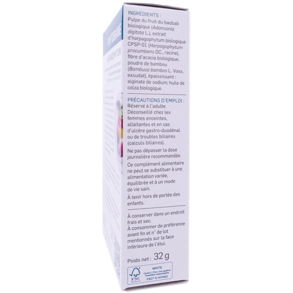 Pulpe du fruit du baobab biologique (Adansonia digitata L.), extrait d'harpagophytum biologique CPSP-01 (Harpagophytum procumbens DC., racine), fibre d'acacia biologique, poudre de bambou (Bambusa bambos L. Voss, exsudat), épaississant : alginate de sodium; huile de colza biologique..