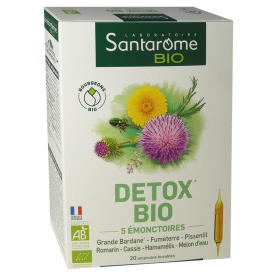 Le laboratoire Santarome basé en France, développe des compléments alimentaires à base de plantes naturelles et biologiques pour répondre aux besoins de tous au quotidien (articulation, fonctionnement du foie,…). DETOX bio, est un complément alimentaire conditionné en ampoule à base d'extraits de plantes bio et de macérât de bourgeons dont l’association va participer au fonctionnement normal d’élimination de l’organisme. La bardane et le cassis associés au pissenlit , romarin, et fumeterre visent à favoriser le bon fonctionnement du foie et à purifier le corps afin d’assurer les bonnes fonctions d’élimination et de purification. Riches en acides aminés, enzymes, vitamines, minéraux, oligo éléments, les macérât de bourgeon de frêne et églantier renforcent la formule.