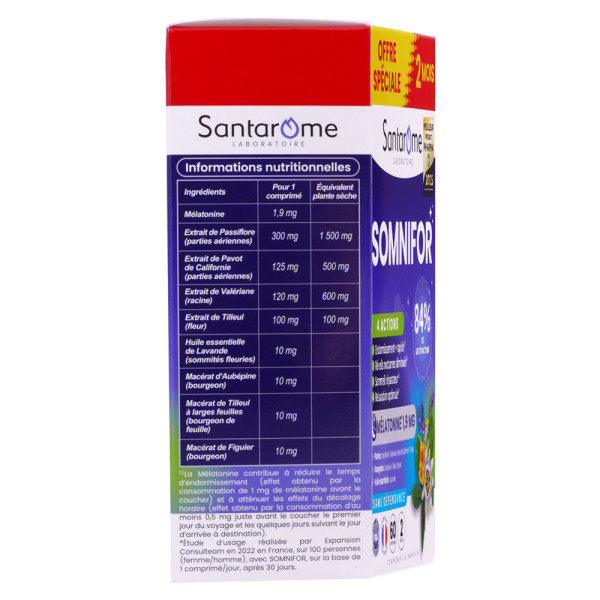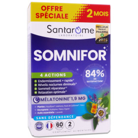 SOMNIFOR 4 ACTIONS 60 COMPRIMES pas cher de SANTAROME PHYTO, le complément alimentaire avec des extraits de plantes et des bourgeons associés à de la mélatonine, dans votre parapharmacie en ligne à prix pas cher.